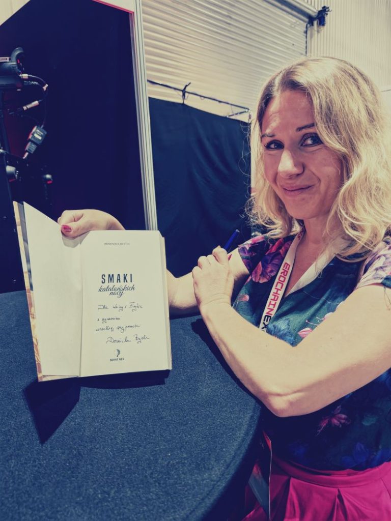 Dominika Brych — autorka powieści „Smaki katalońskich nocy”, którą właśnie czytamy (też niebawem pojawi się u nas recenzja). Poza pisaniem działa też jako edukatorka seksualna, a prywatnie — jest przemiłą, ciepłą osobą, która w naturalny sposób zjednuje sobie ludzi. Spotkaliśmy się również z jej równie sympatycznym mężem — i nie da się nie zauważyć, jak bardzo wspierają się nawzajem.