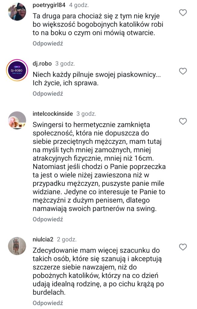 Ale wyznajcie, że razem z mężem/żoną czy partnerem/partnerką realizujecie wspólnie swoje fantazje erotyczne, to zostaniecie wyzwani od patologii, perwersów, zboczeńców. Będą wam wmawiać, że się nie kochacie, że wasz związek przechodzi kryzys i w swingu szukacie ratunku. Usłyszycie, że jesteście kurwami i dziwkarzami. Ci „życzliwi” będą współczuć waszym rodzinom i straszyć ogniem piekielnym. Świat się skończy z waszego grzesznego i niemoralnego powodu. Wy bezwstydni ladacznicy. Czy nie macie sumienia?