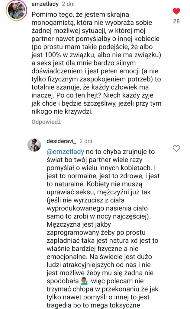 Co było oczywistym, ich „przeciwnikami” była monogamiczna para katolików. Prawie monogamiczna, gdyż byli w trójkącie z Jezusem. I wiecie co – to wszystko jest ok, bo jak wielokrotnie podkreślamy, każdy buduje związek na fundamentach, które jemu/jej pasuje. Jeżeli obydwie strony zgadzają się na wszystkie warunki, to nieważne czy jest się w trójkącie z Jezusem, Buddą, Allahem, singlem czy singielką. Istotne czy wszystkim w tym układzie jest dobrze. Tyle i aż tyle. Ale bądźmy też uczciwi, o ile w liberalnych środowiskach znajdzie się jeszcze tolerancja dla konserwatyzmu, tak w drugim kierunku, tego zrozumienia nie ma wcale. Jest za to hejt, nienawiść i wyzwiska.
