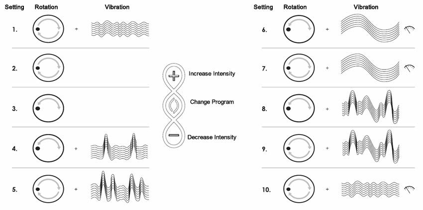 O tym co było dalej napiszę za chwilę. Wpierw krótkie wprowadzenie, czym tak naprawdę Ora 2 jest. Otóż jest to innowacyjny symulator łechtaczkowy, którego zadaniem jest naśladowanie ruchu języka podczas seksu oralnego. Do wyboru mamy 10 trybów wibracji. Pięć z nich to opcja z zataczaniem pełnego kółeczka wokół łechtaczki, zaś pozostałe pięć to opcje półobrotowe, tak aby ruchy wokół clitoris były szybsze. Każdy z trybów, to także inny rodzaj wibracji, których intensywność możemy zmieniać za pomocą przycisków „+” i „-”. Rodzaj stymulacji przełączany jest przyciskiem środkowym. Najlepiej funkcjonowanie przedstawia ten rysunek: