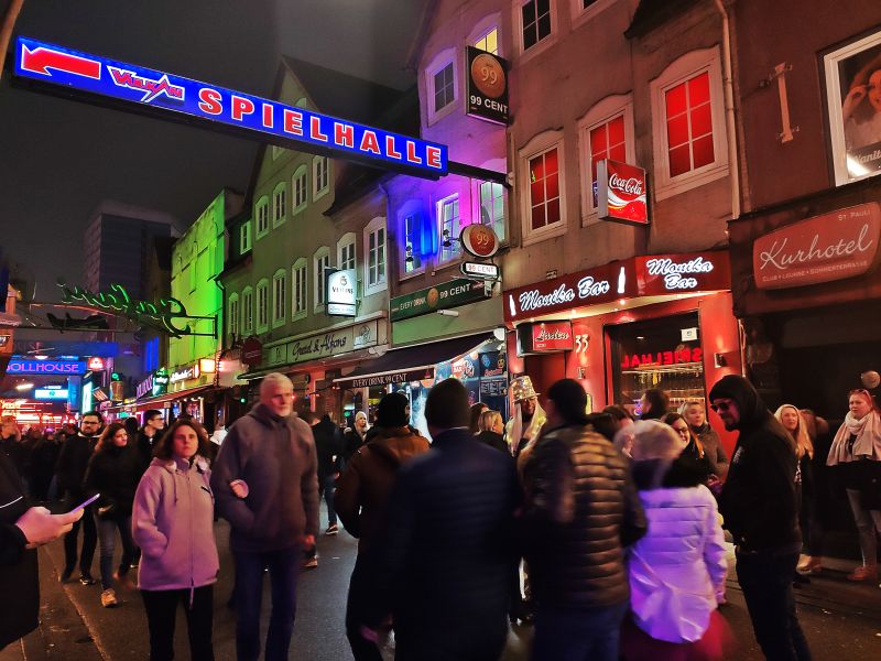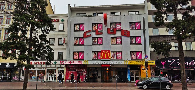 Jedna z najsłynniejszych ulic w Niemczech, znajdująca się w dzielnicy grzechu i rozpusty – St. Pauli. Miejsce łatwo dostępnego seksu i erotycznego kiczu. Mieszanka brudnych pragnień i niezaspokojonych żądz. Poszliśmy tam za dnia, poszliśmy wieczorem. Poszukiwaliśmy kontrastów i je odnaleźliśmy. W ciągu dnia to miejsce dość niepozorne, acz specyficzne. Tu mijamy McDonald`s, nad którym widnieją zdjęcia roznegliżowanych pań z przyciągającymi hasłami „Eintritt frei” oraz „Sex 39 €”, a po przeciwnej stronie widzimy policyjny komisariat.